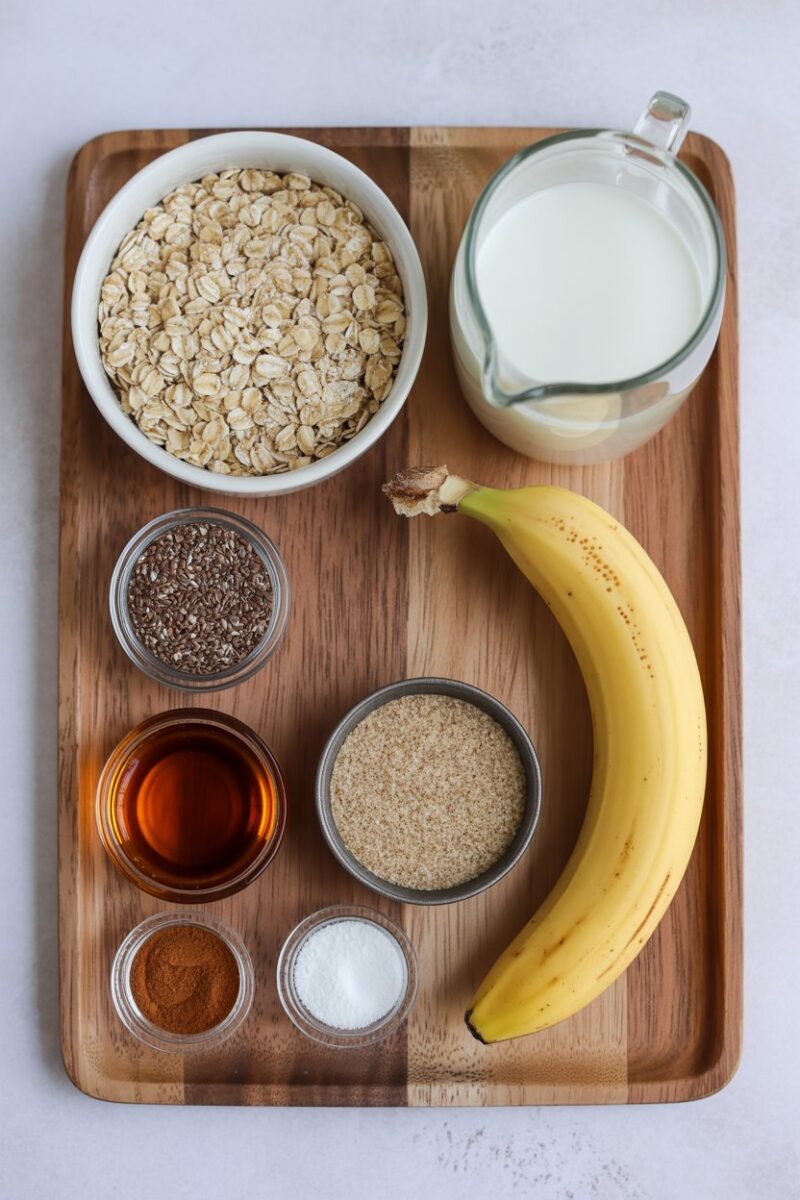 Begin by choosing a jar or a container with a lid. Combine the old-fashioned rolled oats, chia seeds, and ground flaxseed (if using) inside the container. Add the mashed banana, pouring in any juices from the fruit to capture every bit of sweet flavor.