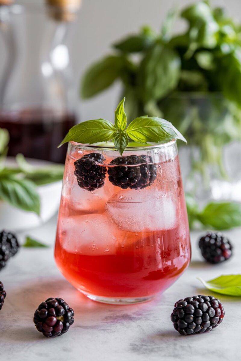 Finally, strain or pour the mixture into a tall glass filled with fresh ice. Top with chilled sparkling water for a little fizz, and garnish with a few extra blackberries and a sprig of basil. Enjoy every fruity, herbaceous sip!