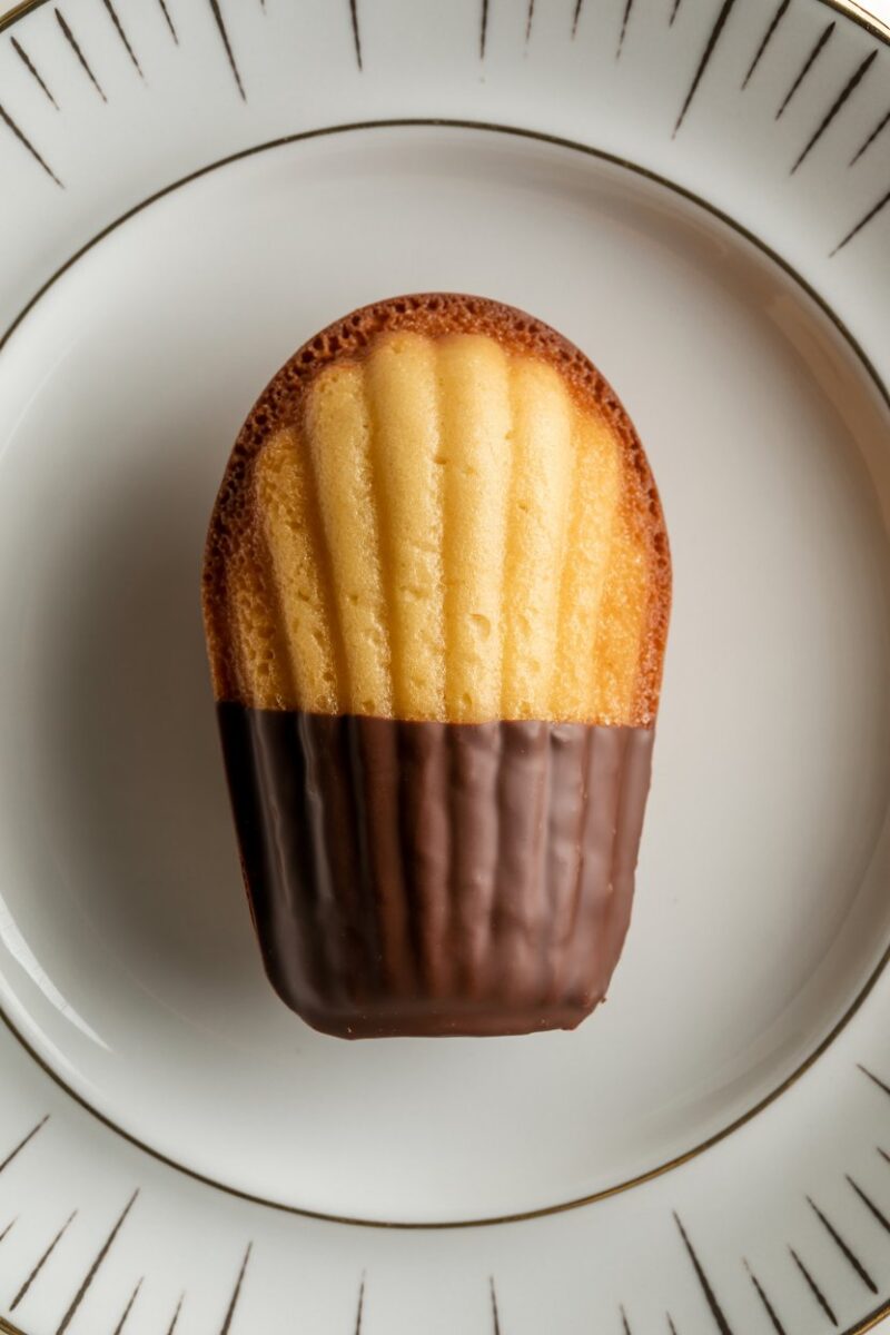 Meanwhile, melt the chocolate in a microwave-safe bowl or using a double boiler. Dip each madeleine halfway into the melted chocolate and place them on parchment or wax paper to set. A quick chill in the refrigerator (five minutes or so) helps the chocolate firm up.