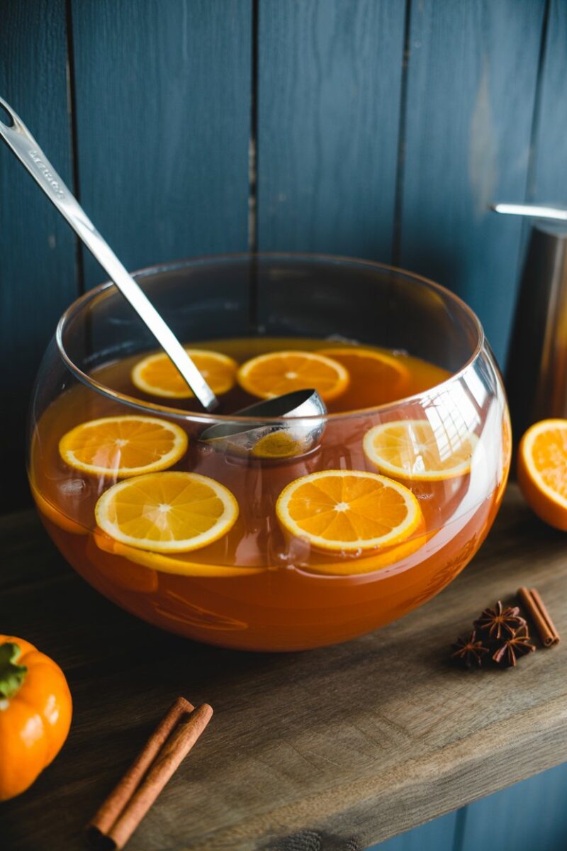 Puree ripe persimmons with orange juice, strain, and add a cinnamon-clove syrup. Dilute with ginger ale right before guests arrive. The punch showcases an underused winter fruit with warming spices. A large ice block keeps it chilled without watering things down.