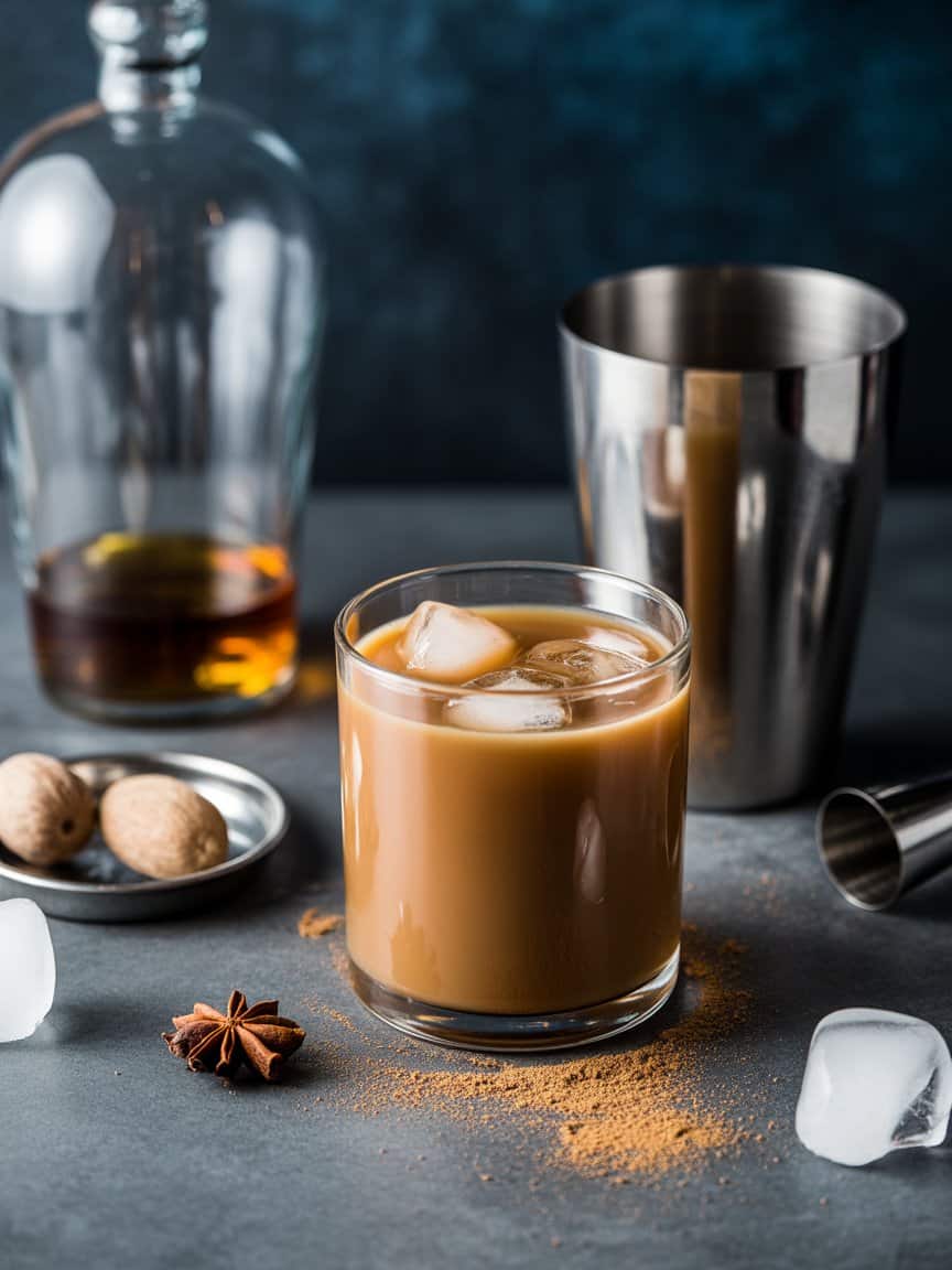 Next, in a cocktail shaker or small pitcher, combine the Irish cream, spiced rum, ginger simple syrup, ground cinnamon, and nutmeg. Fill the shaker with a handful of ice cubes, and give it a good shake—about 15 seconds or so should do the trick. You want everything well-chilled and swoon-worthy.