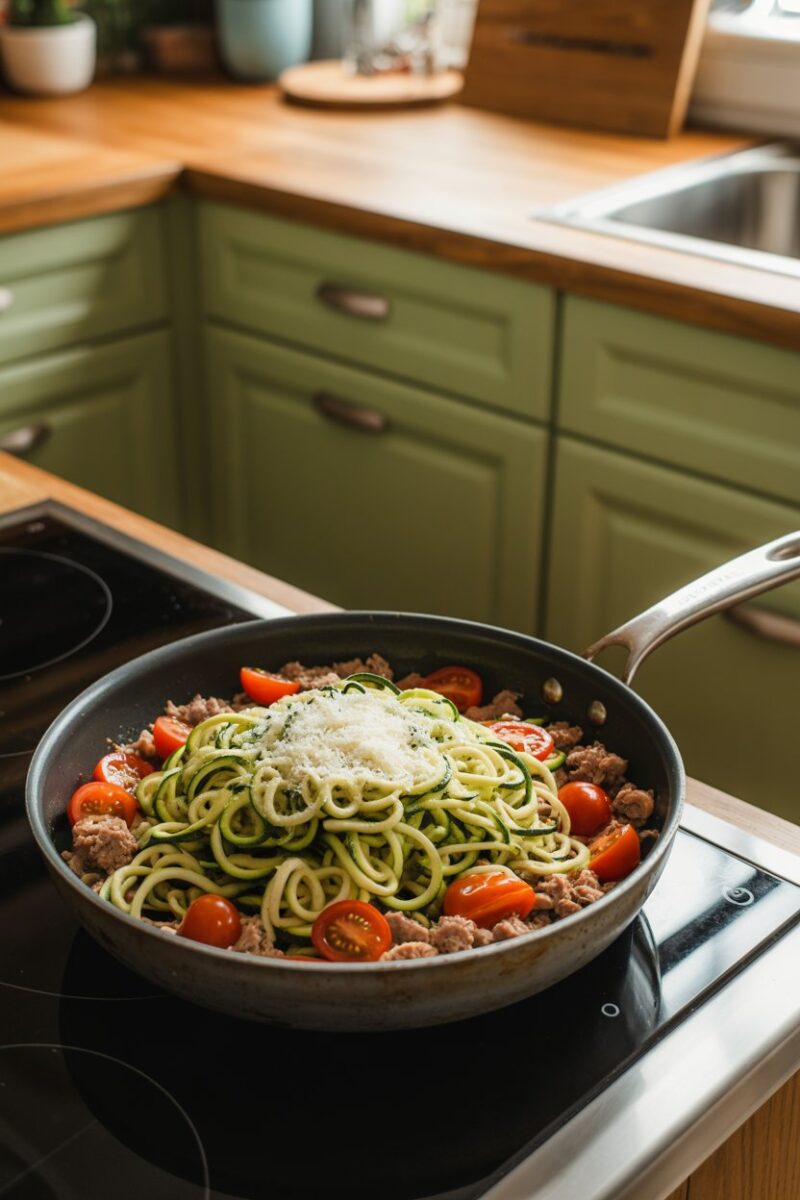 Spaghetti night meets low-carb freshness. Brown turkey with garlic, then toss in zucchini noodles and vegetables until just tender. A splash of white wine and lemon keeps flavors bright. Finish with Parmesan and fresh basil for Italian flair.