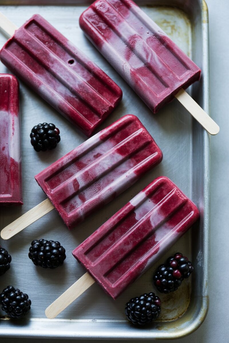 Brew a strong hibiscus tea, sweeten lightly with agave, then blend with fresh blackberries for vivid color. Strain if you prefer a smoother texture, or leave the seeds for extra fiber. Freeze in molds and insert wooden sticks. The tart floral flavor feels grown-up yet refreshing.