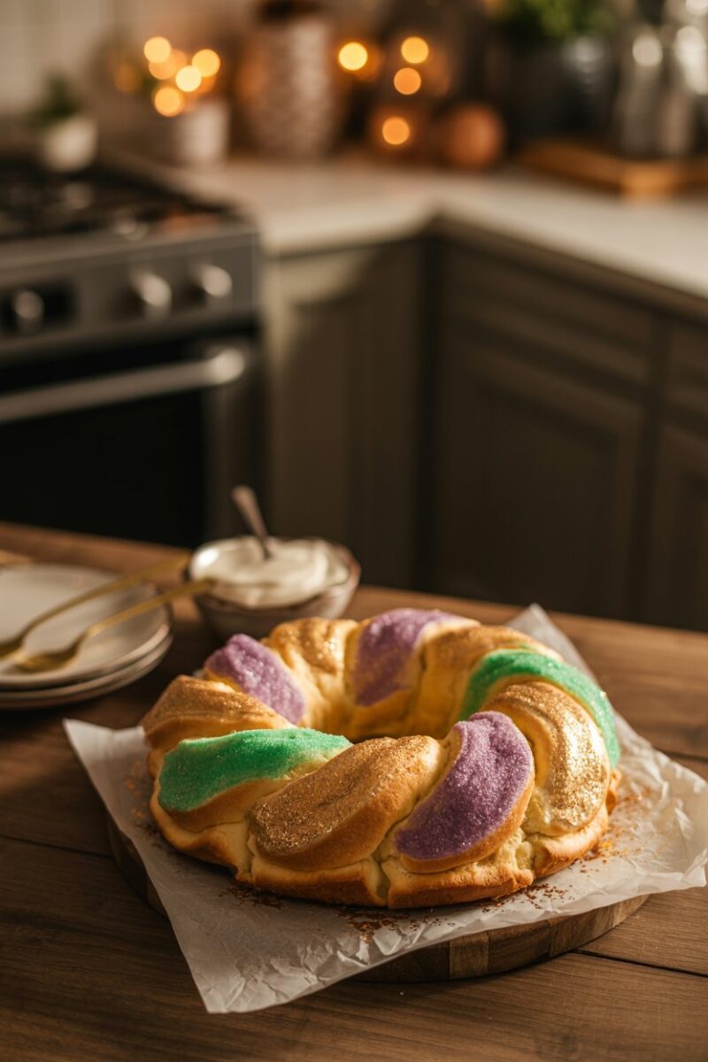 This beloved brioche wreath is filled with brown sugar, cinnamon, and butter, then baked until lightly puffed and glossy. Once cooled, a simple powdered-sugar glaze becomes the glue for vibrant sanding-sugar stripes. Tuck the tiny plastic baby under one slice before serving to keep tradition alive. It’s the bake most New Orleanians can spot from a block away.