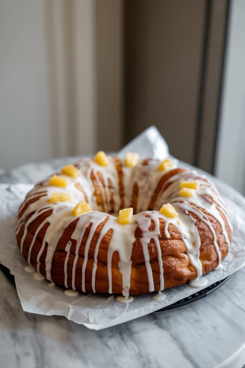 Tropical flair arrives via crushed pineapple mixed into a buttery filling, plus a dark-rum glaze that soaks the warm bread. The alcohol cooks off, leaving rich molasses notes behind. Finish with toasted coconut flakes for a beachy crunch. It pairs nicely with a tall glass of iced café au lait.