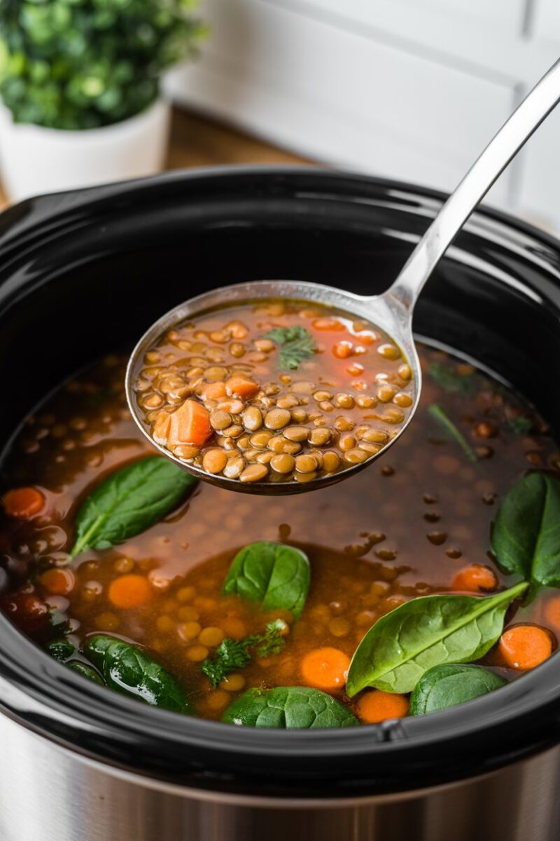 Lentils simmer in vegetable broth with carrots, celery, and diced tomatoes until thick and comforting. A splash of vinegar at the end brightens the flavor. Portion into mason jars for easy grab-and-heat meals. The soup keeps five days refrigerated or three months frozen.