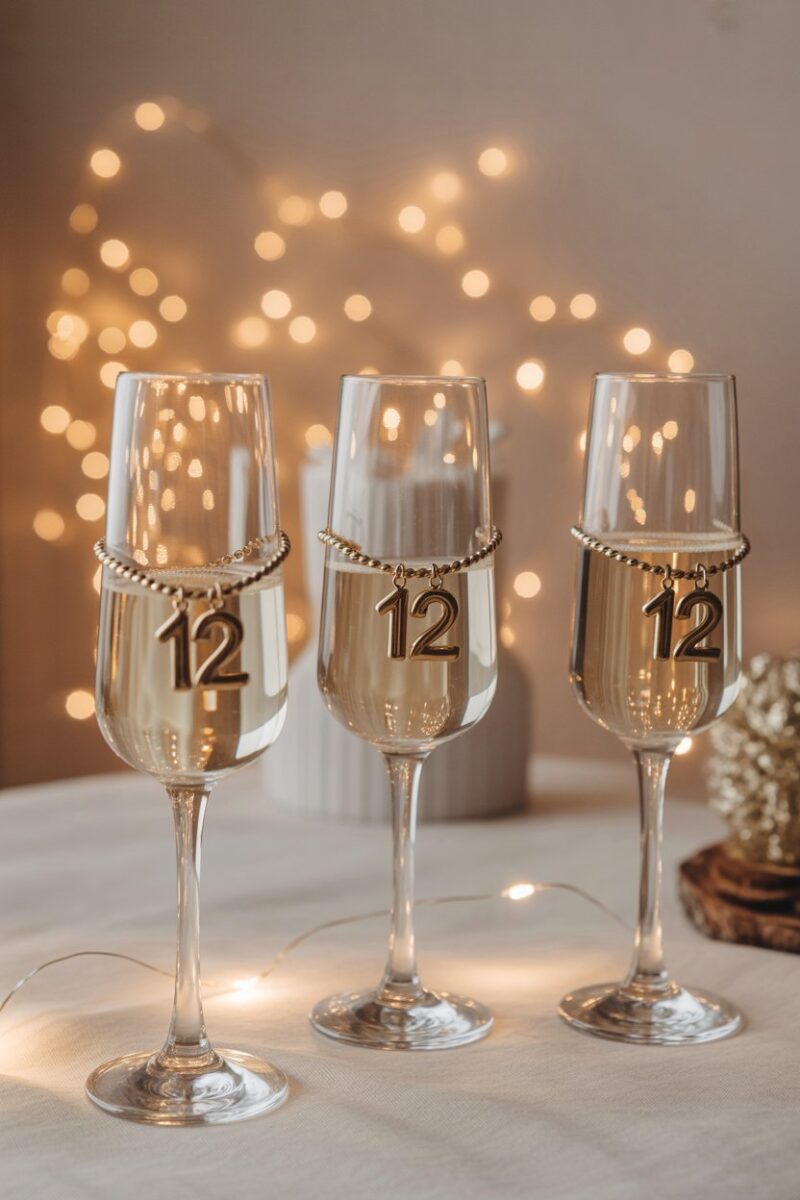 Attach numbered charms to each stem so guests can track their glass through the evening. Start at one o’clock and pass out the matching number at each hour leading up to midnight for a playful tic-tac toward the big moment. It prevents mix-ups and doubles as a souvenir. Just be sure the charms are dishwasher-safe for easy cleanup.