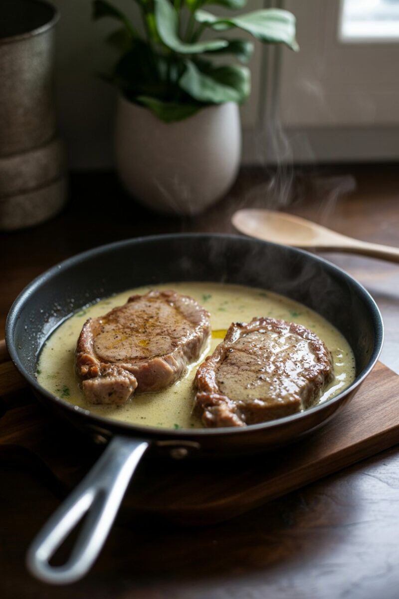 After searing, whisk in chicken broth, a dollop of Dijon, and a touch of cream right in the same pan. The fond from the chops dissolves into the sauce, delivering deep flavor with minimal effort. Serve over buttered egg noodles to soak up every drop.
