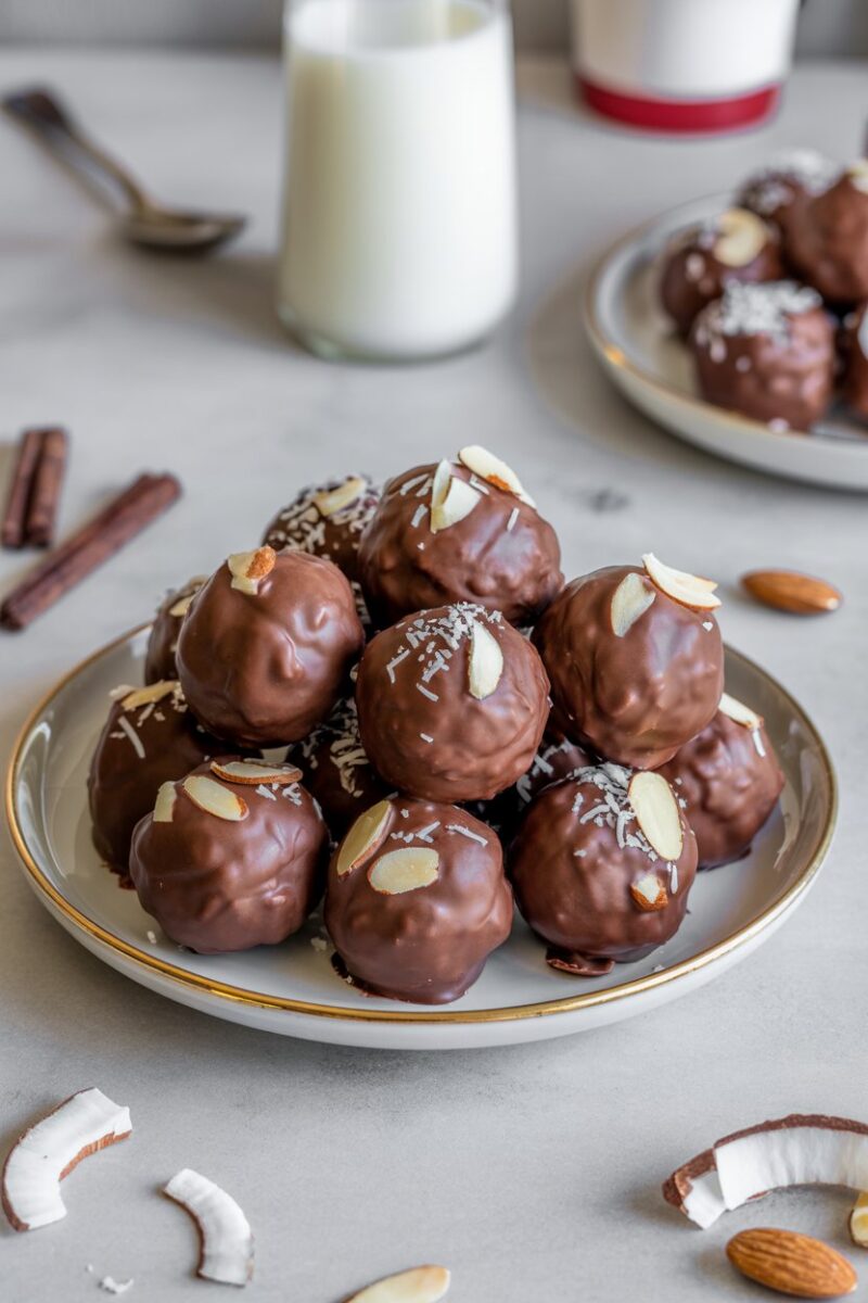 Cocoa powder, unsweetened coconut, and almond pieces echo the flavors of the classic candy bar. Almond butter supports the theme while chocolate protein powder boosts the numbers. A quick roll in melted dark chocolate (allowed to harden) gives a thin shell. You get all the nostalgia without the sugar crash.