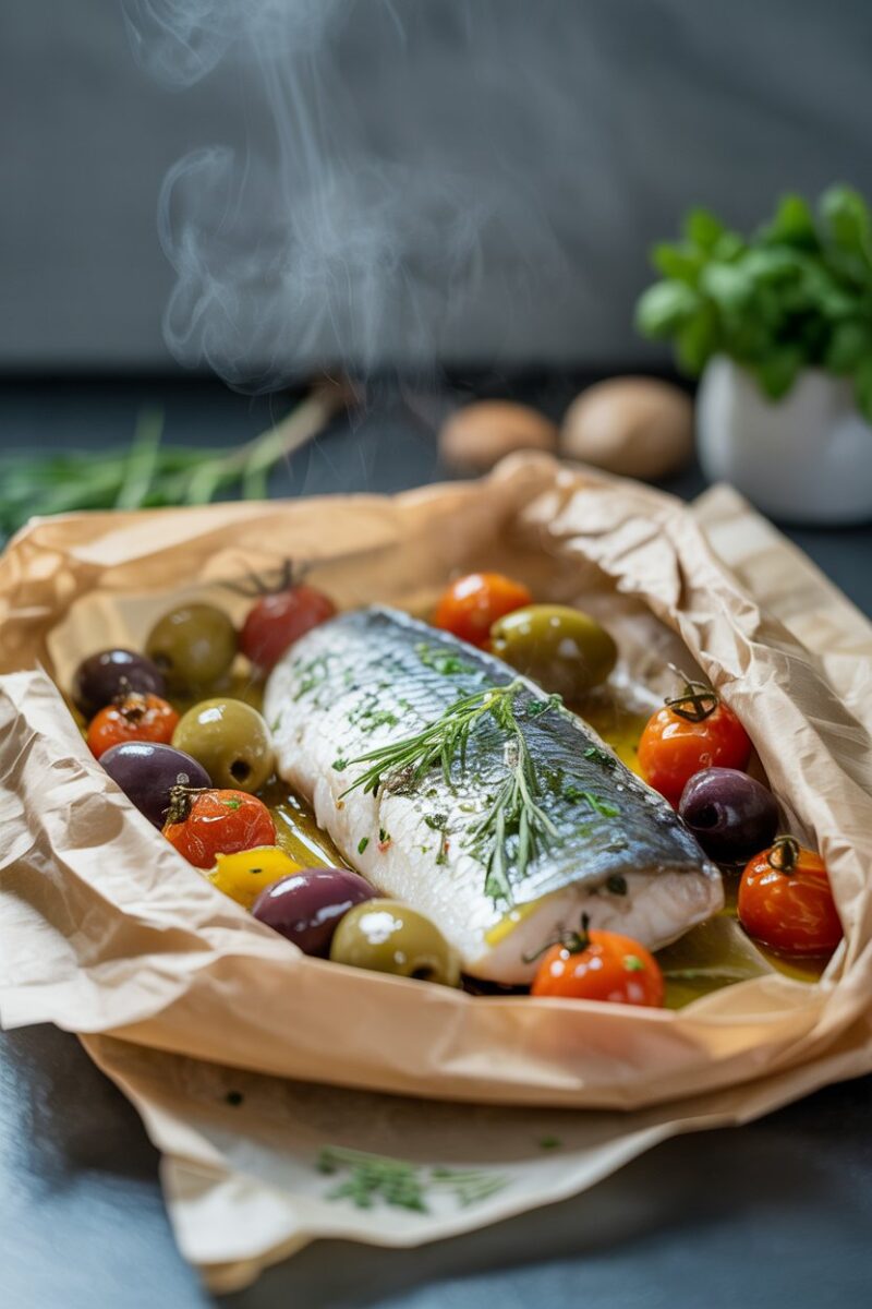 Baking fish in parchment keeps it moist and locks in aromatics. Sea bass pairs well with briny olives, tomatoes, and a drizzle of olive oil. Diners open their own packets at the table for a bit of theatrical flair.