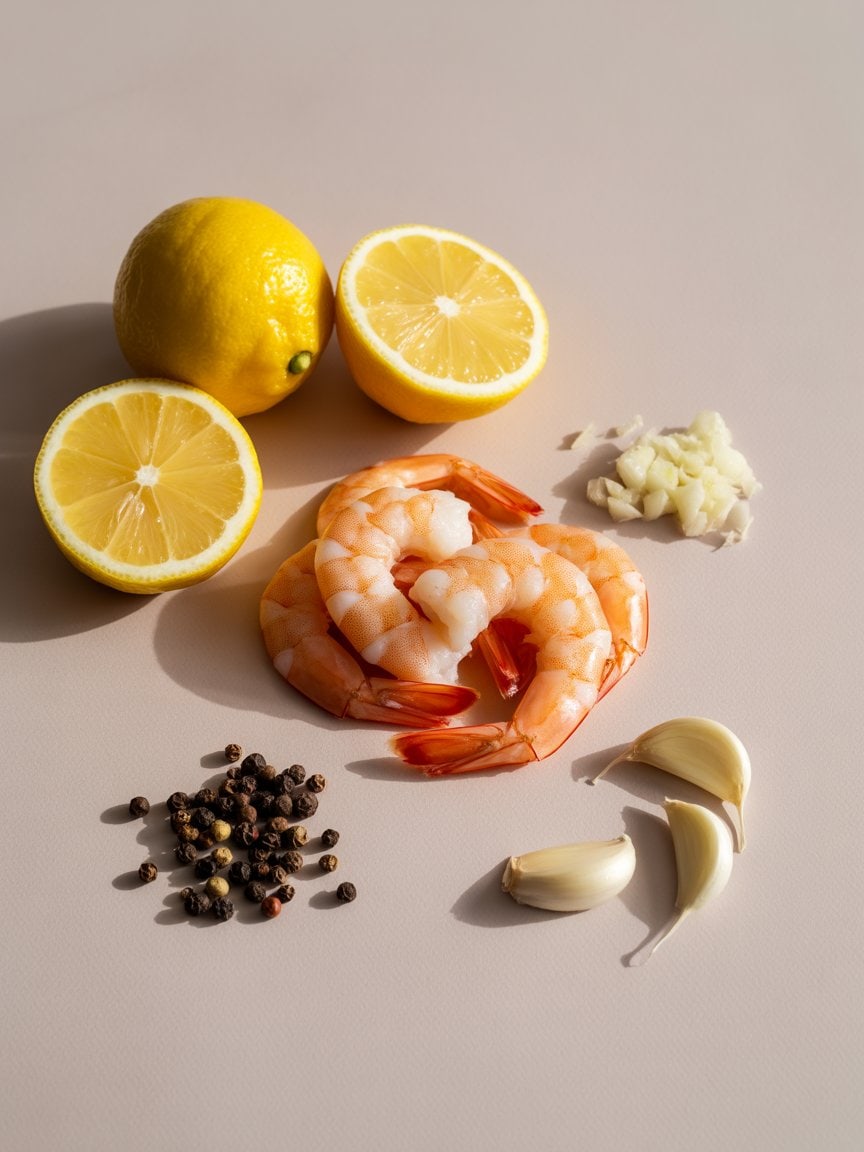 Bring the water to a low boil in a medium pot. Toss in the sliced lemon, crushed garlic, salt, and black peppercorns. Let these aromatics infuse the water for a couple of minutes.