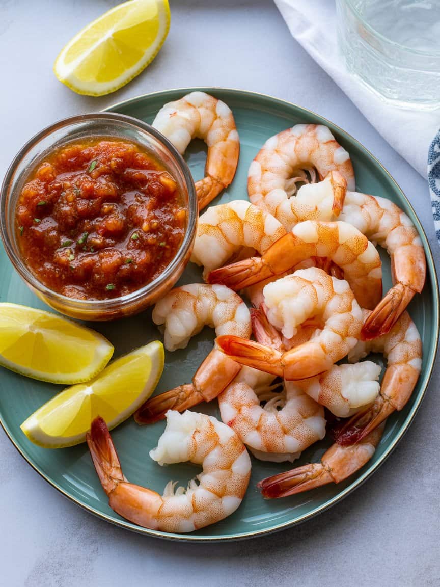 To serve, arrange the chilled shrimp on a platter or in individual cocktail glasses. Pair them with your spicy cocktail sauce and garnish with extra lemon wedges on the side.