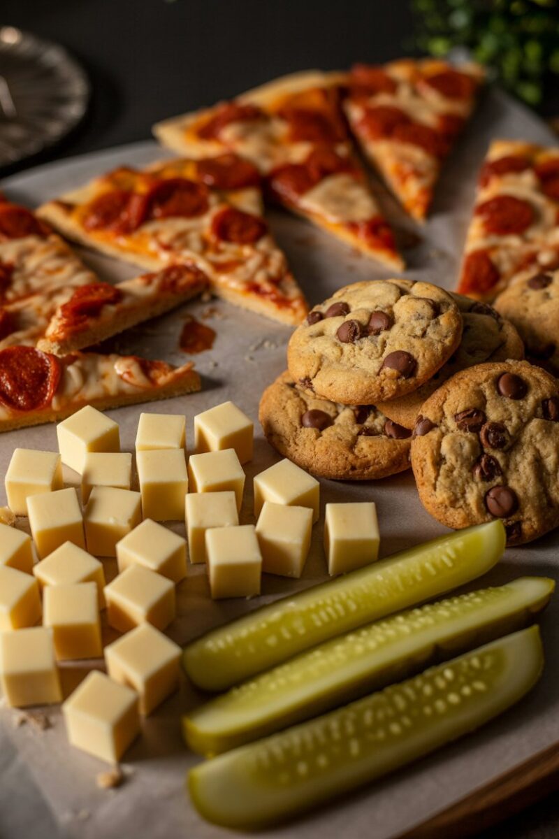When date night stretches past midnight, raid the fridge for a casual yet satisfying board. Slice leftover pizza into dippable strips, add pepper jack cubes for a cheese fix, and toss on spicy pickles for zing. Finish with a few chocolate chip cookies for that necessary sweet bite. It’s proof that you can make magic from whatever is on hand.