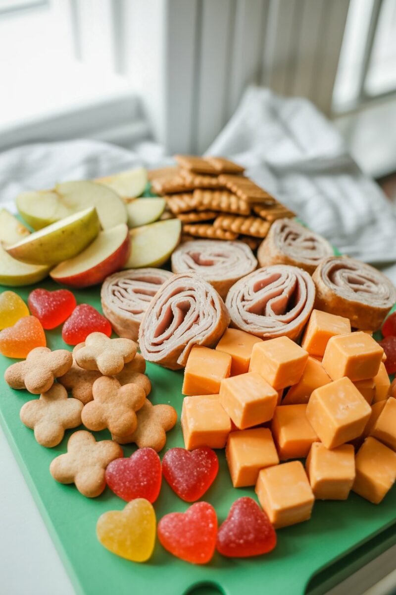Kids appreciate the fun of a DIY snack plate. Mild cheeses, turkey roll-ups, apple slices, and pretzel sticks keep things simple and familiar. A few gummy hearts satisfy sweet cravings without overwhelming the board. Pair with pink lemonade for a family-friendly toast.