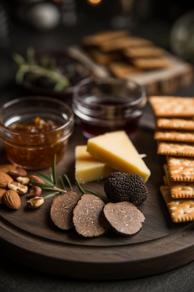 A little truffle goes a long way in elevating a board. Slice truffle salami thinly and pair with truffle-infused cheddar or gouda. Add fig jam for sweetness and mixed nuts for crunch. Keep portions small; the rich flavors shine best in measured bites.