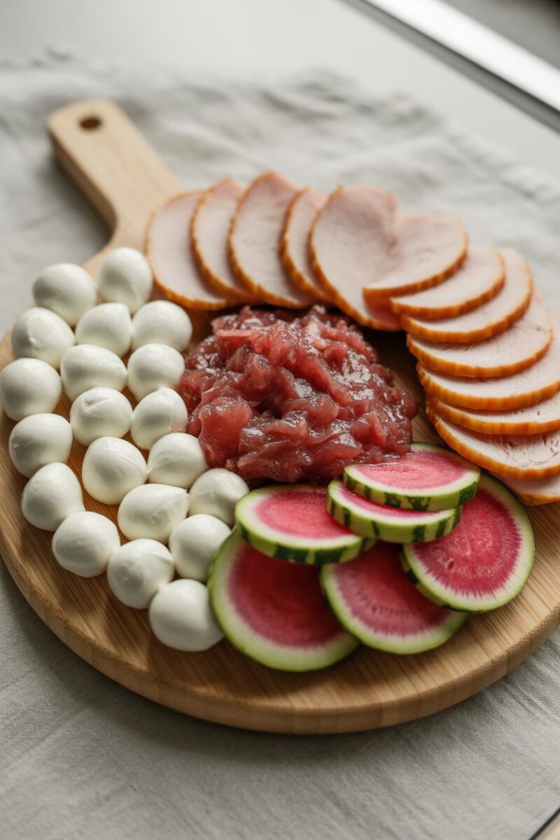Think pink without going overboard. Prosciutto cotto, fresh mozzarella, and watermelon radish provide subtle hues that look gorgeous beside a chilled bottle of rosé. Add rose-petal or strawberry jam for spreading on crusty baguette slices. Finish with pistachios for a hint of green color contrast and pleasant crunch.