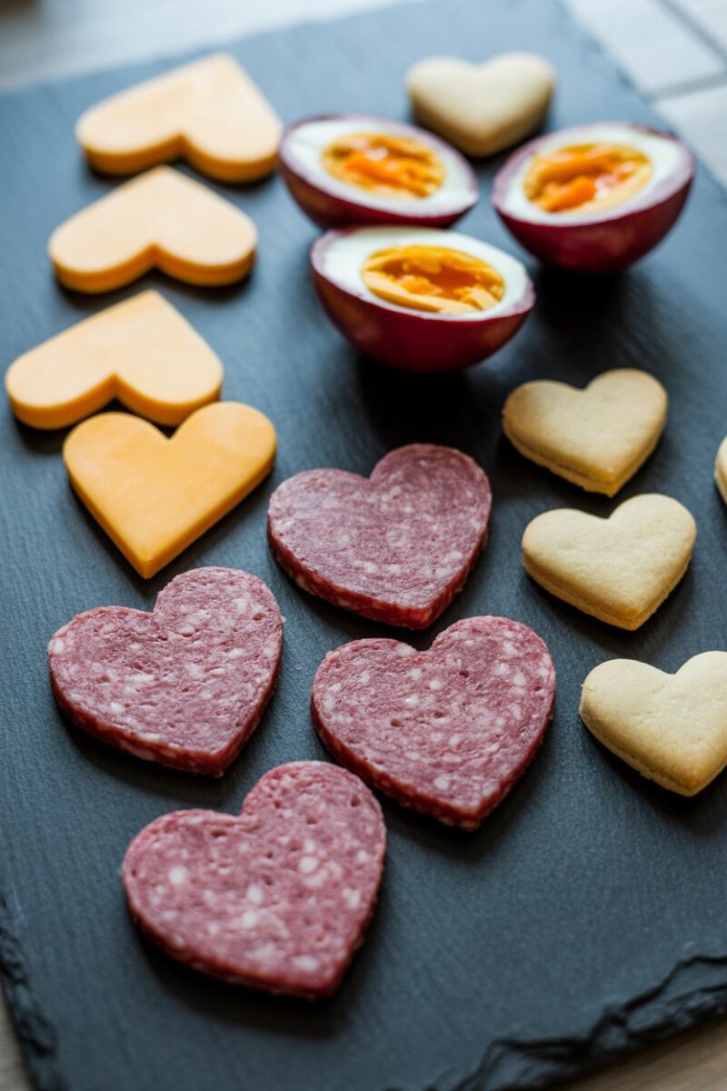 A set of heart-shaped cookie cutters transforms everyday ingredients into themed delights. Slice mozzarella, cheddar, and salami into neat hearts, then add beet-tinted hard-boiled eggs for color. Fill gaps with heart-shaped butter cookies to echo the motif in dessert form. The result feels whimsical without being fussy.