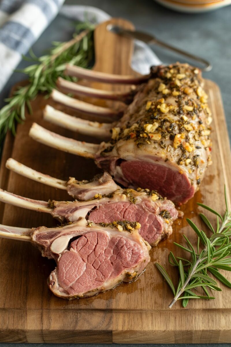 Frenched lamb racks look impressive but cook quickly. Rub with minced garlic, rosemary, thyme, and olive oil before roasting to medium-rare. Resting ensures juices redistribute for tender bites. Serve alongside creamy mashed potatoes or minted peas.