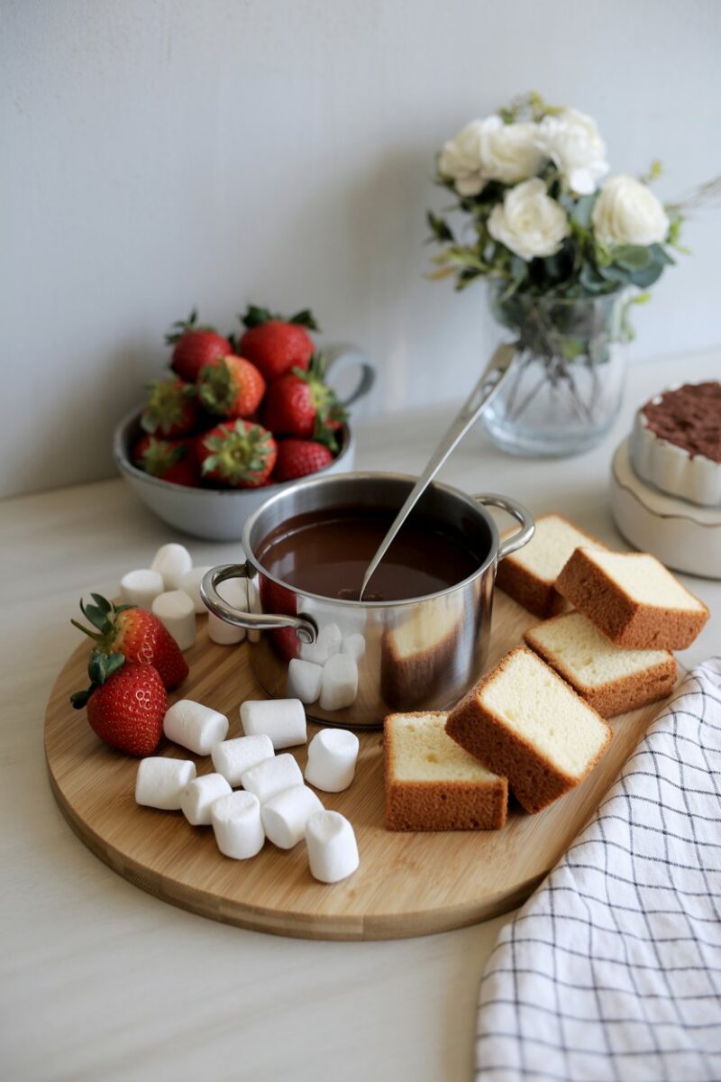 Fondue turns dessert into an interactive event. Melt quality chocolate with a splash of cream to achieve a silky dip that stays fluid over gentle heat. Offer bite-sized dippers such as fruit, pretzels, and cake. Provide skewers so everyone can share the pot without mess.