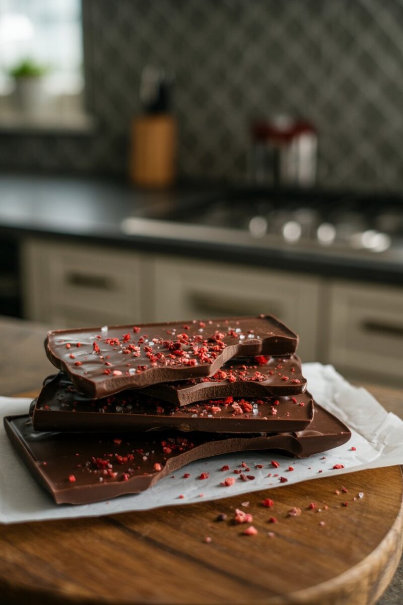 Tempered chocolate ensures a shiny snap, but even a simple melt-and-spread method works in a pinch. Scatter freeze-dried raspberries and strawberries over the warm chocolate for bright pops of color and flavor. Finish with flaky salt to sharpen the sweetness. Once firm, break into irregular pieces for a rustic look.