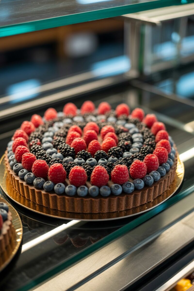 A crisp cocoa pâte sucrée shell holds ganache so smooth it mirrors the berries piled on top. Use a mix of fresh berries for color variety and natural tartness. Brush the fruit with warmed apricot jam for a subtle shine. Slice with a hot knife for picture-perfect wedges.