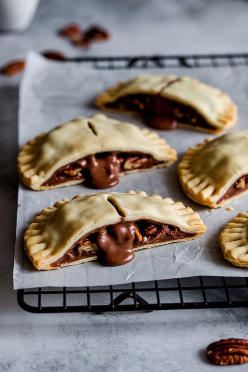 Pie dough circles are filled with a mixture of chopped pecans, dark chocolate, brown sugar, and a kiss of bourbon. Crimp the edges, brush with egg wash, and bake until blistered and golden. The filling turns gooey while nuts stay toasty. Serve slightly warm for the best texture contrast.