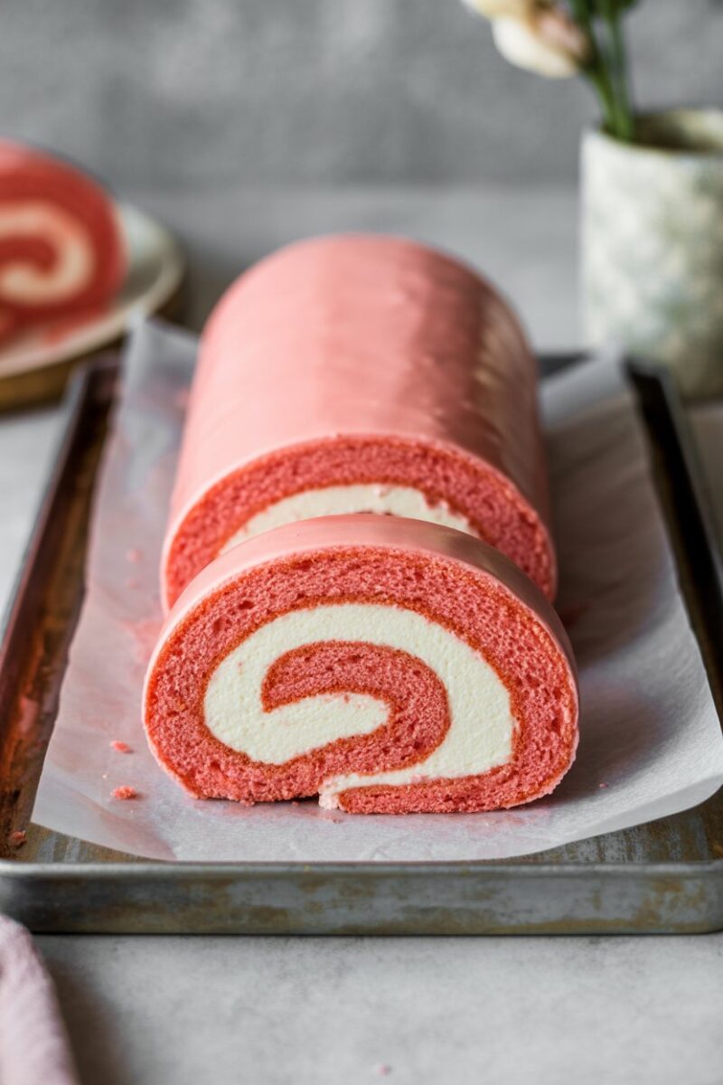 A thin sponge cake tinted soft pink bakes in minutes, then cools wrapped in a towel to remember its curl. Cream cheese frosting spreads over the unrolled cake before it’s carefully rolled back up. Chill to set the spiral, then slice to reveal neat rings. The subtle cocoa note gives it that signature velvet taste.