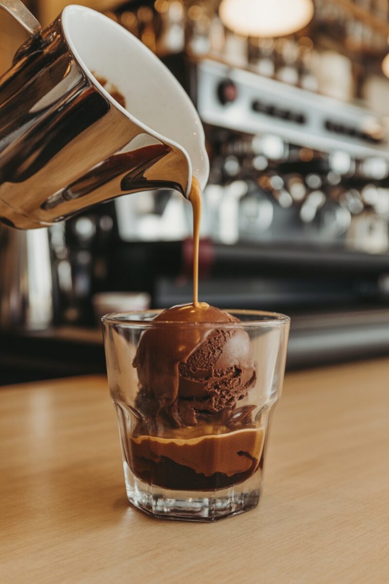 A scoop of dense chocolate gelato sits in a glass, waiting for a shot of fresh espresso. The hot coffee melts the edges, creating a creamy pool that you can sip or spoon. Garnish with chocolate shavings if you like extra drama. Serve immediately so temperatures contrast.