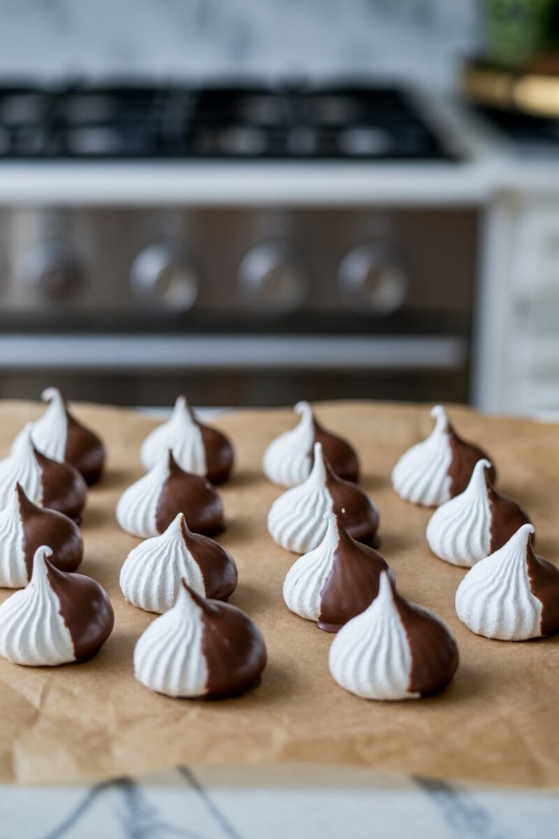 Low-temperature baking dries the meringues until they’re crisp and airy. Once cooled, a quick plunge in melted chocolate dresses them for the holiday. Red sprinkles or freeze-dried berry powder look festive against the white shell. Store in an airtight container to keep humidity away.