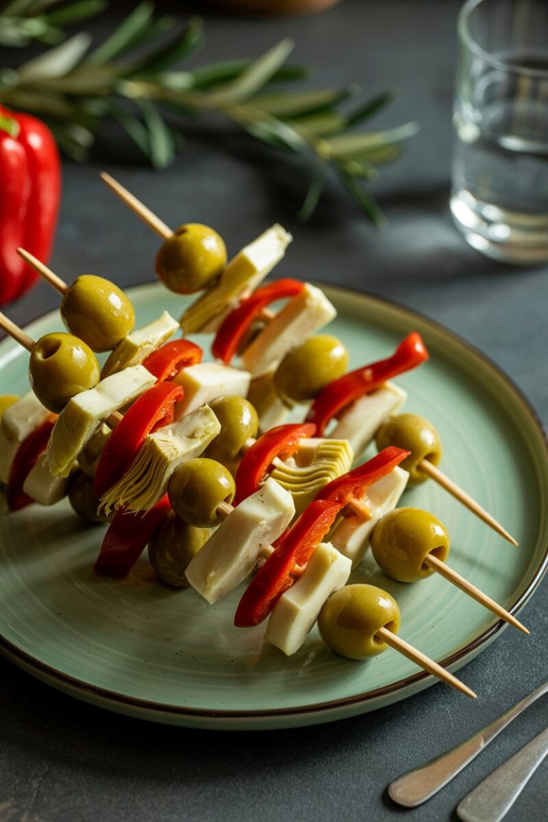 Store-cupboard staples shine when soaked in garlic, lemon, and herb oil. Skewering the pieces creates a fuss-free finger food. Serve chilled or room temperature, making this a low-maintenance option.