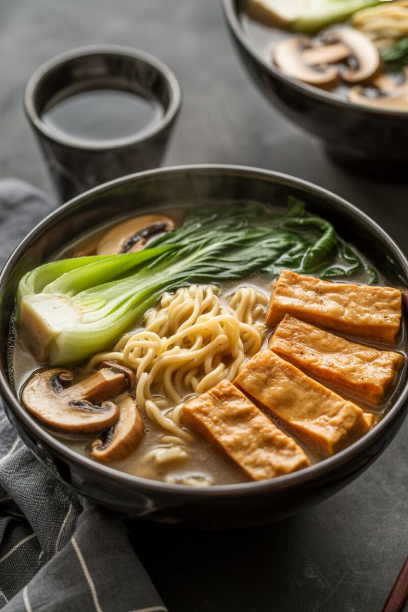 A quick broth built from miso, soy, and fresh ginger tastes like it simmered all afternoon. Ramen noodles soak up the fragrant liquid while vegetables stay bright. Pan-seared tofu adds protein and a satisfying chew.